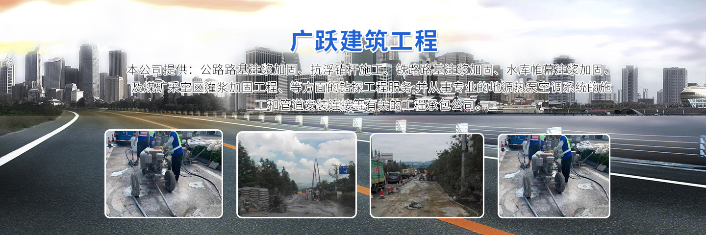 徐州廣躍建筑工程有限公司,公司成立于2010年,有專業(yè)施工人員50人,從事專業(yè)加固注漿施工。 本公司提供:公路路基注漿加固、抗浮錨桿施工、鐵路路基注漿加固、水庫(kù)帷幕注漿加固、及煤礦采空區(qū)灌漿加固工程、等方面的鉆探工程服務(wù);并從事專業(yè)的地源熱泵空調(diào)系統(tǒng)的施工和管道安裝連接等有關(guān)的工程承包公司。 公司成立以來(lái)一直專注于地質(zhì)鉆井工作,技術(shù)力量雄厚、設(shè)備先進(jìn):擁有專業(yè)的機(jī)械地質(zhì)鉆井精英隊(duì)伍;并具有GSY --150鉆機(jī)30余臺(tái)、GSY---200鉆機(jī)20余臺(tái)、專業(yè)回填封孔砂漿泵4臺(tái)等機(jī)械設(shè)備。公司稟承“優(yōu)質(zhì)的工程、優(yōu)惠的價(jià)格、優(yōu)良的售后服務(wù)”的經(jīng)營(yíng)理念,以“客戶滿意”為原則,著力打造一支高效、專業(yè)、信譽(yù)的工程服務(wù)團(tuán)隊(duì)。 具體服務(wù)項(xiàng)目:工程施工降水井、水源空調(diào)井、地源熱泵井、機(jī)鉆深井(工廠專用井)、石頭井、飲用水井、農(nóng)田井、地基降水處理、大型基坑降水、地下室、車(chē)庫(kù)以及橋梁注漿加固等業(yè)務(wù)。可用于廠生產(chǎn)用水,機(jī)械冷卻用水和生活用水,用水量可根據(jù)貴公司的需求量身訂做。